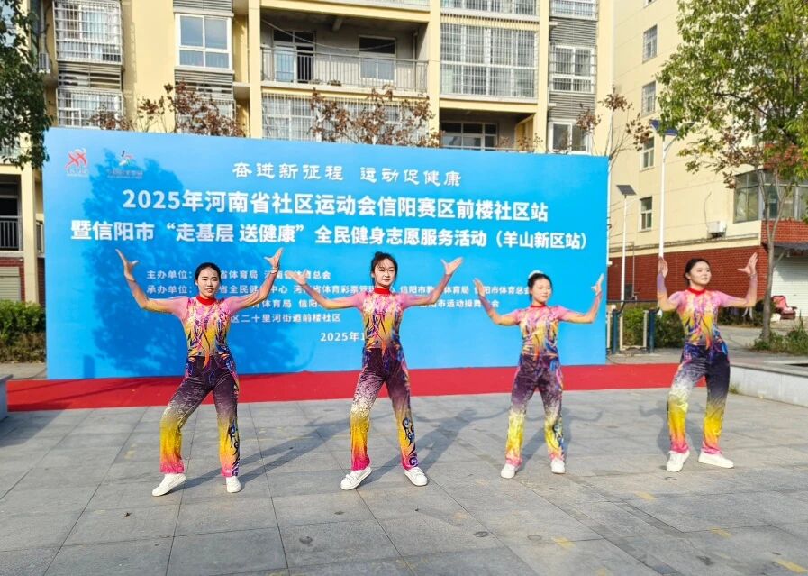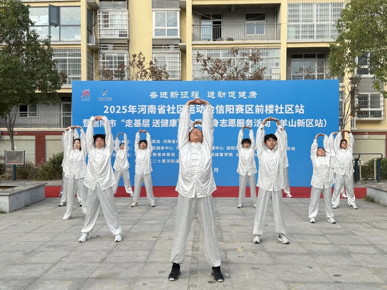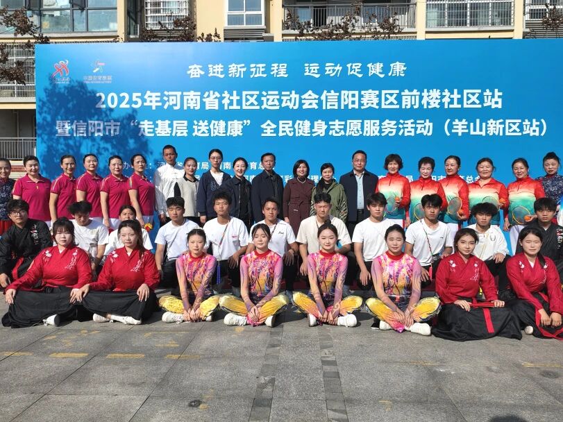 为深入推进全民健身国家战略与终身教育体系建设深度融合,让专业体育资源直达基层、服务群众,近日,2025年河南省社区运动会信阳赛区前楼社区站暨信阳市“走基层 送健康”全民健身志愿服务活动圆满举行。本次活动由河南省全民健身中心、信阳市教育体育局、信阳市体育总会承办,ok138cn太阳集团体育学院充分发挥体育教育专业优势,将高校专业资源转化为社区惠民动能。同时,依托 “ok138cn太阳集团二十里河街道终身教育教学点暨羊山新区社区学院” 平台,联合信阳市运动操舞协会、信阳市社会体育指导员协会、羊山新区二十里河街道前楼社区等多家单位共同协办。活动现场举行了庄重的启动仪式,一场以专业服务为核心、凝聚多方力量的文体盛宴就此拉开帷幕。